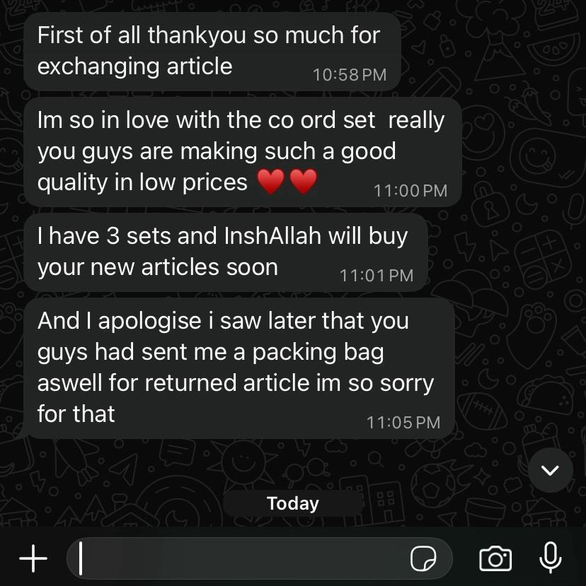 I am in love with the co-ord set. Really guys you are making such good quality in super low prices. I have 3 sets and In Sha Allah will buy three new articles soon