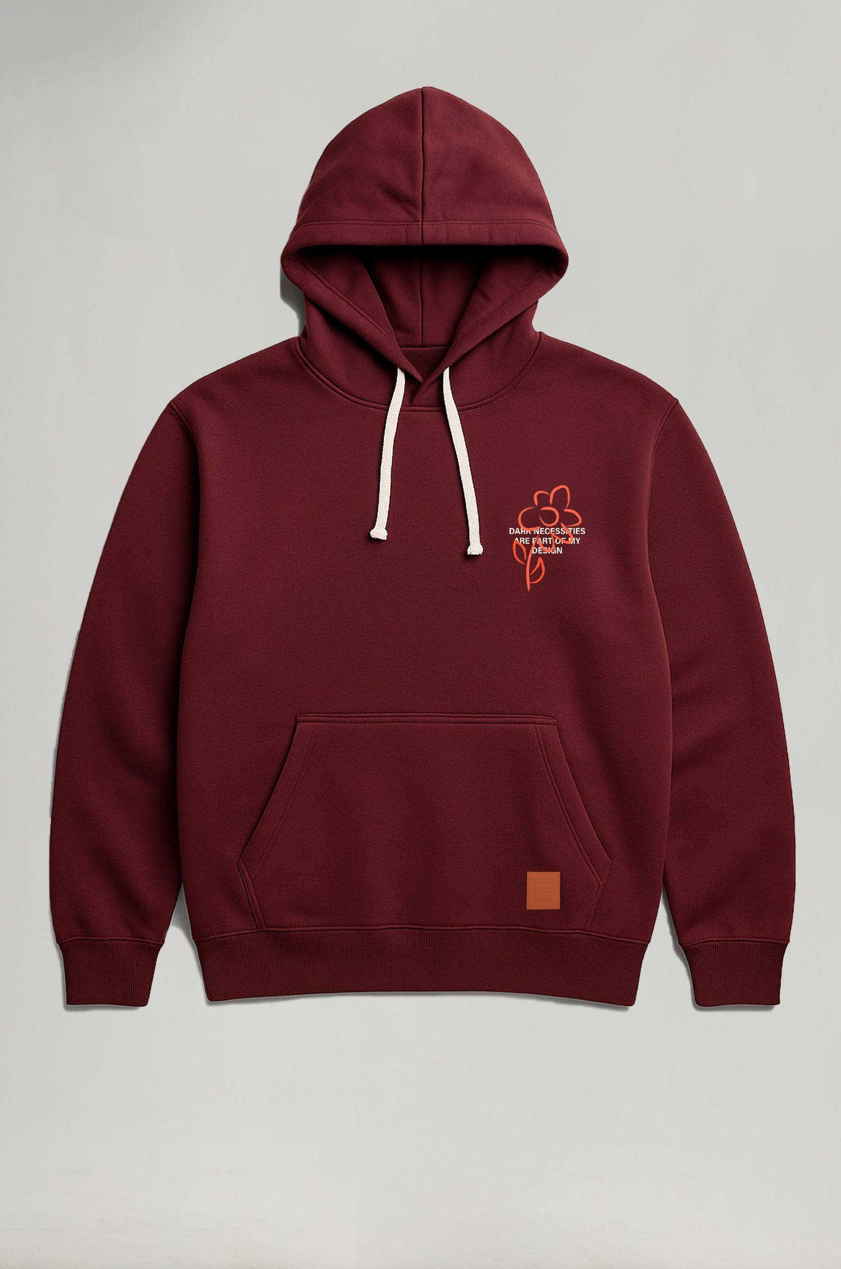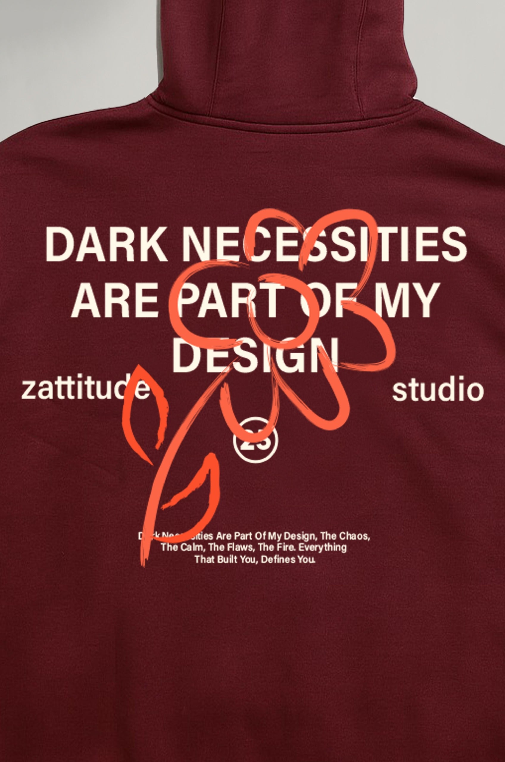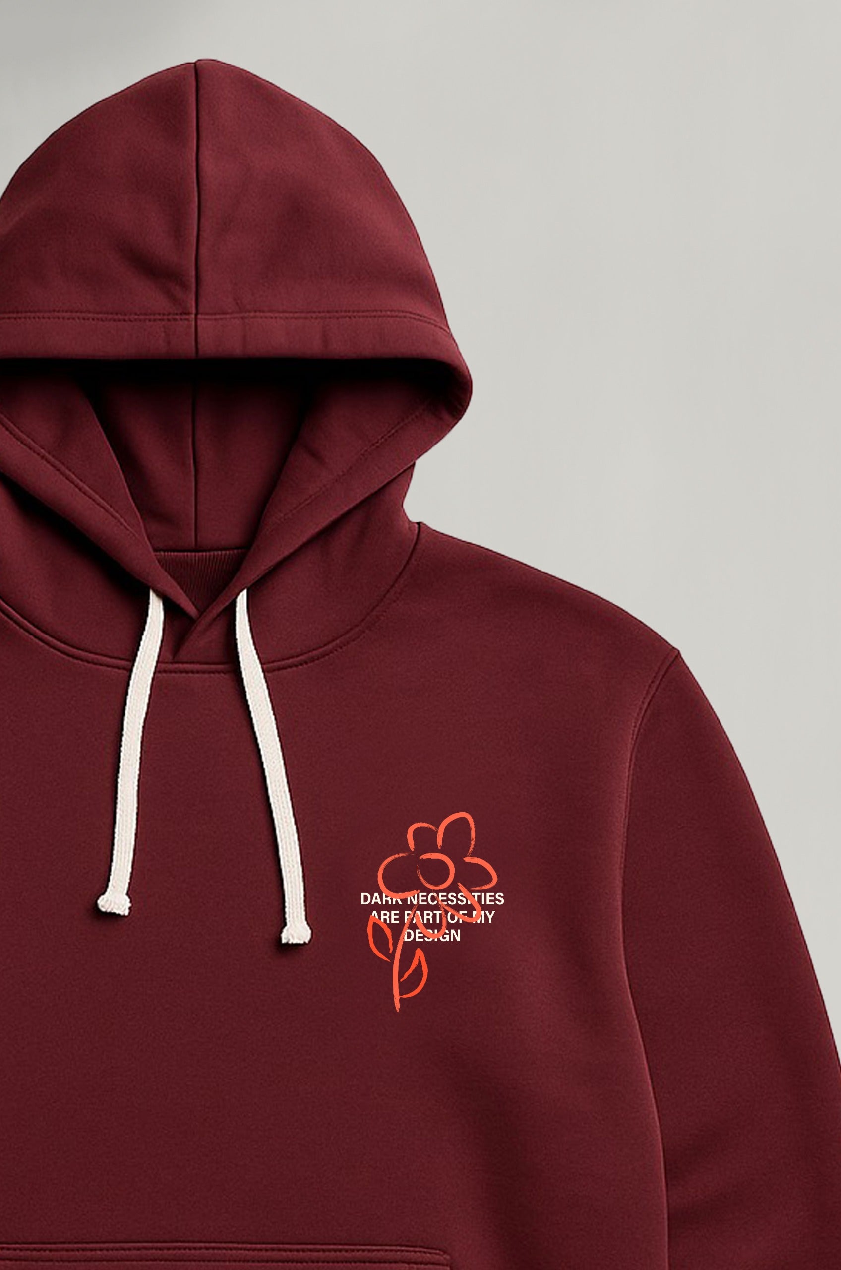 Crafted in a deep, premium maroon shade, this hoodie features our signature hand-drawn abstract flower graphic paired with the statement “Dark Necessities Are Part Of My Design” — a reminder that every flaw, fire, and phase shapes who you become.