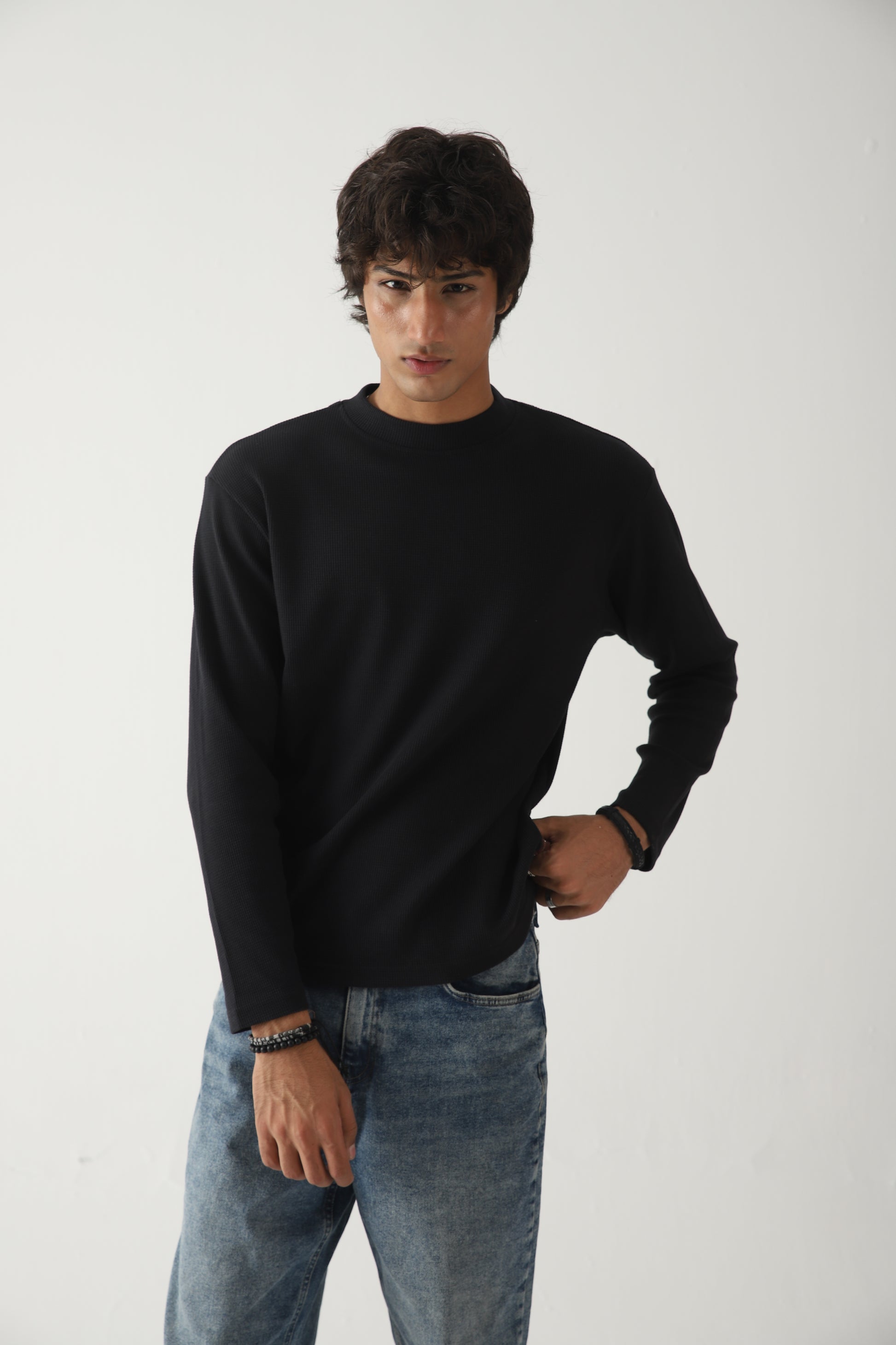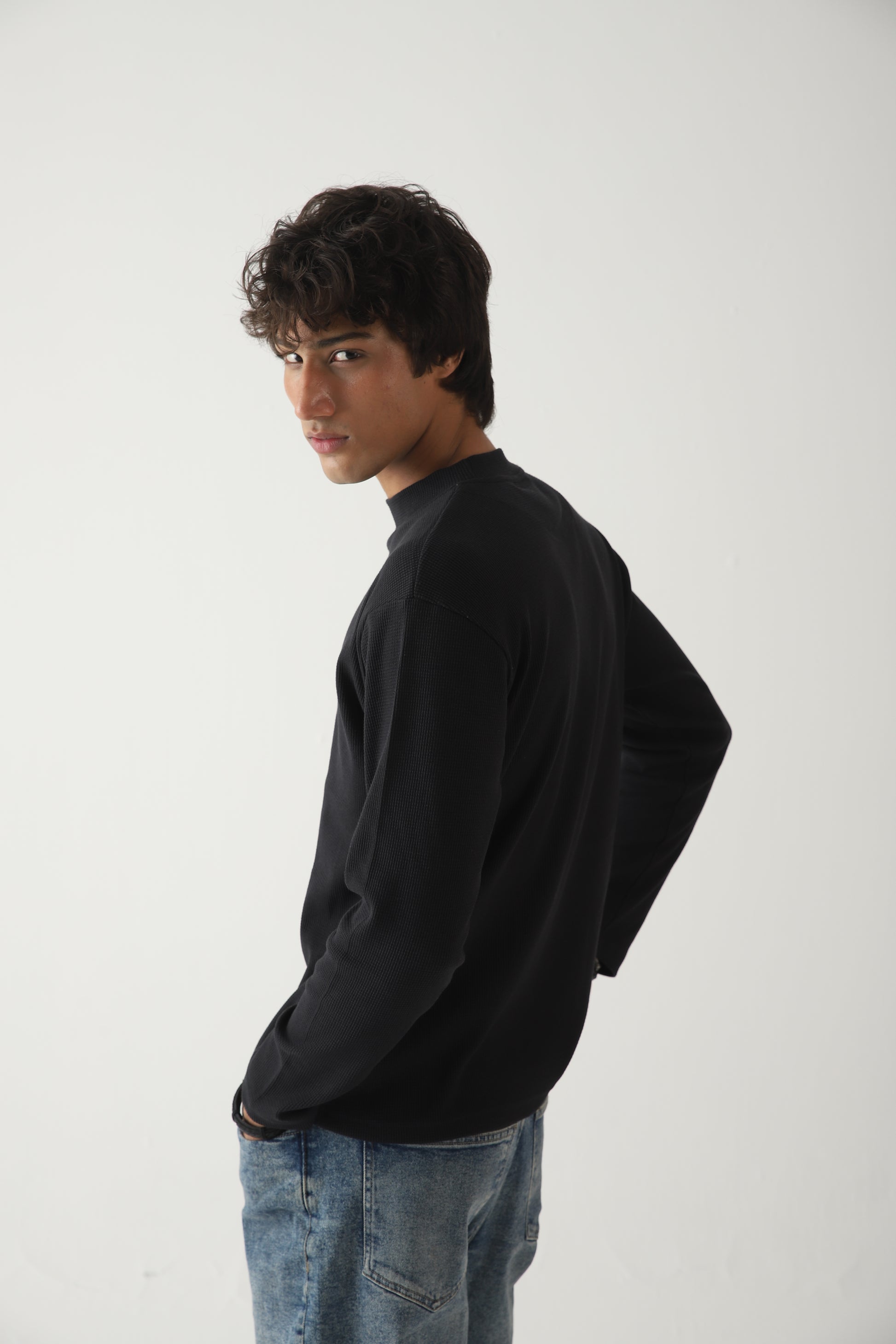 Crafted from premium waffle-textured thermal fabric, it delivers breathable warmth, softness, and structure. Its minimalist black silhouette transitions effortlessly from everyday chill to night hustle — redefining what comfort looks like in motion.