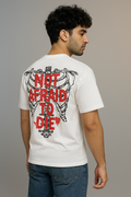 Make a bold statement with the NOT AFRAID Graphic Tee. Crafted from premium Lycra Jersey fabric, this t-shirt ensures superior comfort, breathability, and durability. The front features an edgy, distorted text design, while the back showcases an intense skeletal print with the phrase "NOT AFRAID TO DIE" in striking red & black.